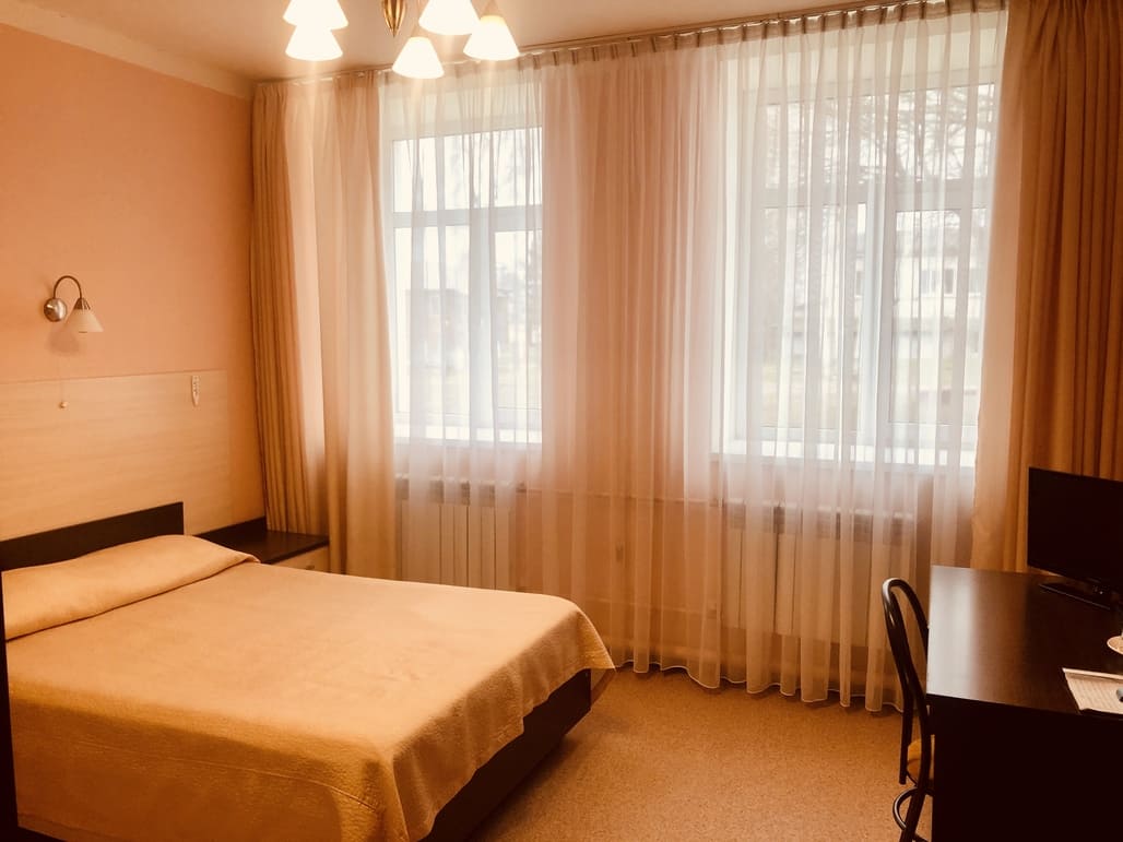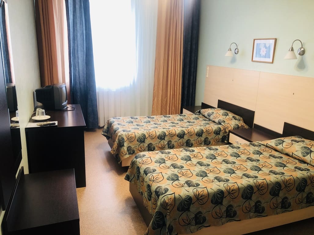 Площадь номера - 18-20 кв.м. 2 осн. места. Мебель: вешалка, зеркало, кровати односпальные /одна двуспальная кровать, прикроватные тумбочки, стол, стулья, шкаф. Оборудование: телевизор, чайный набор посуды. Санузел на блок. Сервис: Wi-Fi бесплатно, смена полотенец, смена постельного белья, уборка номера.